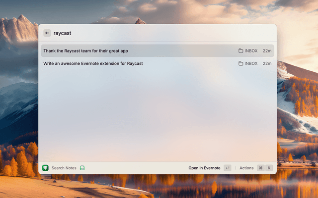 Search your Evernote notes iand open tasks nstantly using the local database of the Mac official Evernote client. Evernote stores your notes in a SQLite database (Library/Application Support/Evernote/conduit-storage/https%3A%2F%2Fwww.evernote.com). This extension allows you to search for your notes using Raycast.