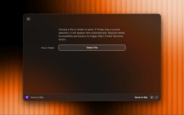Send to Blip: opens a form with a file picker and pre-fills it from the current Finder selection when possible.Send Selected Finder Item to Blip: sends the current Finder selection to Blip immediately.npm installnpm run devThe extension reveals the selected file in Finder and triggers Blip's Finder Services action. This currently requires Accessibility permission so Raycast can drive the Finder menu item.