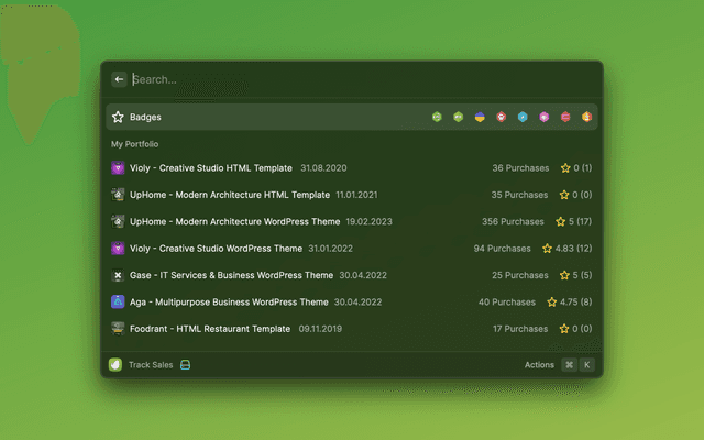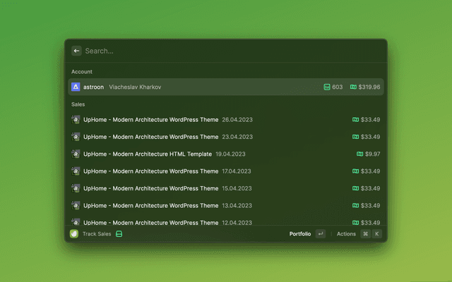 This is a Raycast extension for Envato. With this extension, you can view portfolio, verify purchases, track sales and view purchases.