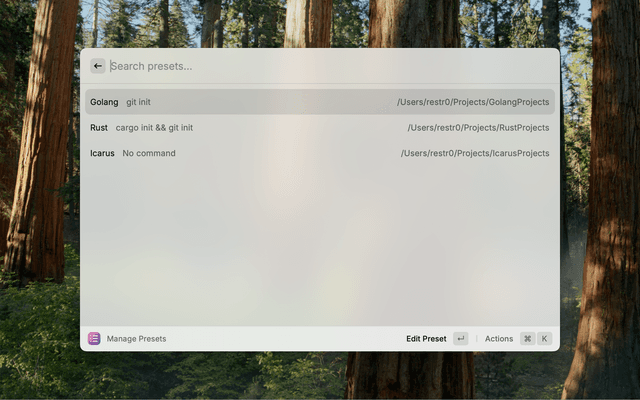 - Create Project Presets: Save your frequently used project folder locations, initialization commands and preferred IDE applications