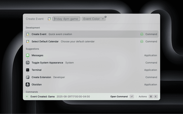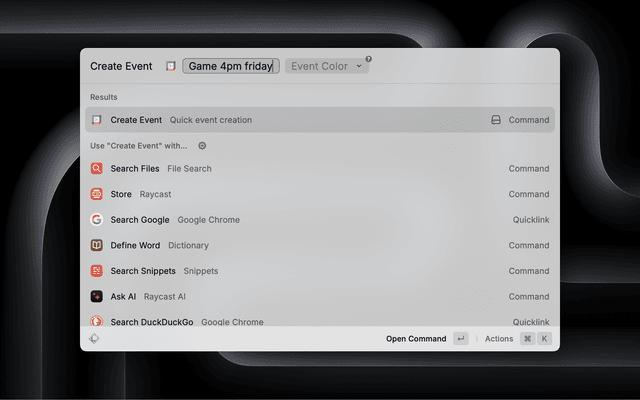 - Raycast AI-Powered Parsing: Automatically extracts dates, times, and locations from your input using Raycast AI