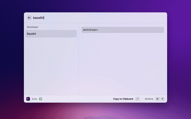 When run, this extension reads the text on the clipboard, then presents a list of Esse's actions for you to choose from. After choosing an action, the transformed text is written back to the clipboard.