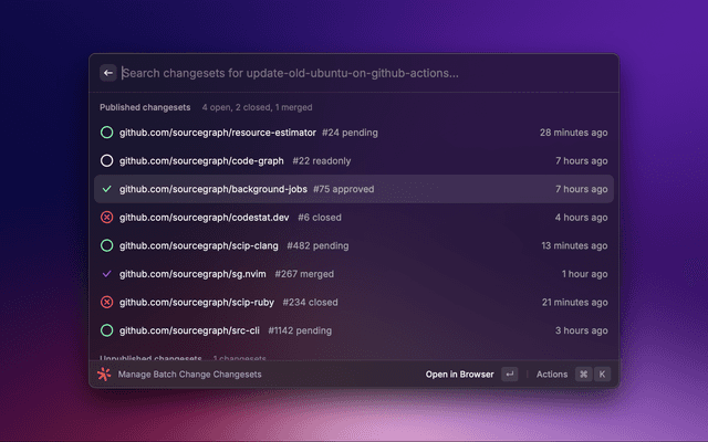 Browse, view, publish, and merge changesets for batch changes straight from Raycast. Batch Changes automate large-scale code changes to keep your code up to date, fix critical security issues, and pay down tech debt across all of your repositories.