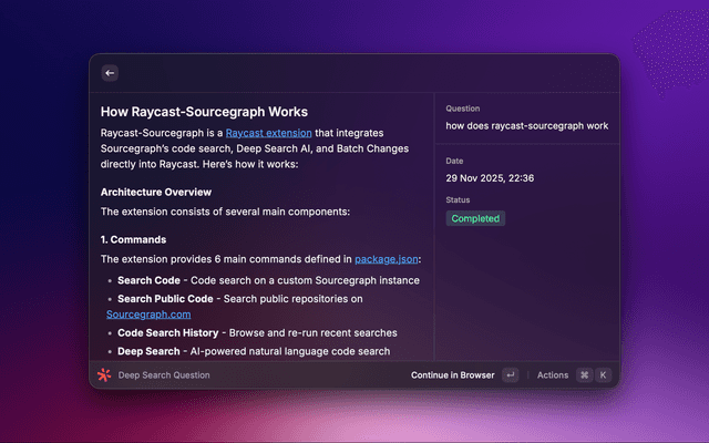Deep Search, Code Search, and Batch Changes on Sourcegraph with Raycast.