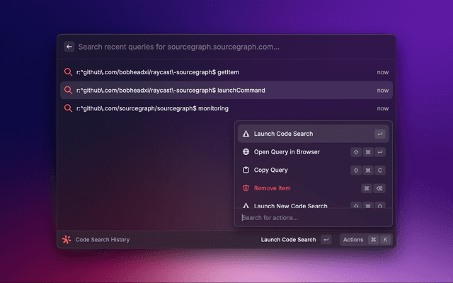 To get started, install Raycast and install the Sourcegraph extension from the Raycast extensions store.