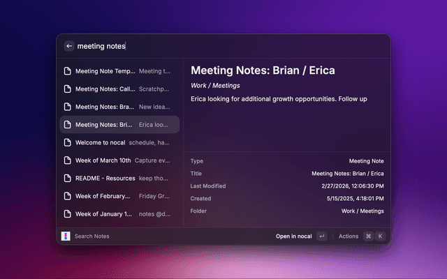 - Search Notes — Browse and search your notes with live preview. Open any note directly in nocal.