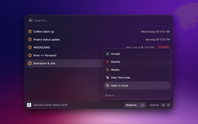 - Pending RSVPs — See calendar events awaiting your response. Accept, decline, or mark as maybe directly from Raycast.