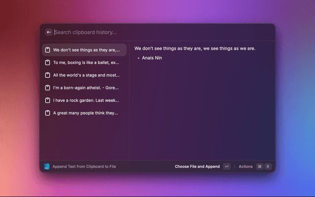 | Append Text from Clipboard to File | Pick text from clipboard history and append it to a file. |