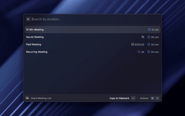 Manage your Cal.com account from Raycast — share meeting links, generate private one-time links, view and act on bookings (accept / decline / cancel / request reschedule), manage availability schedules, and schedule out-of-office entries.