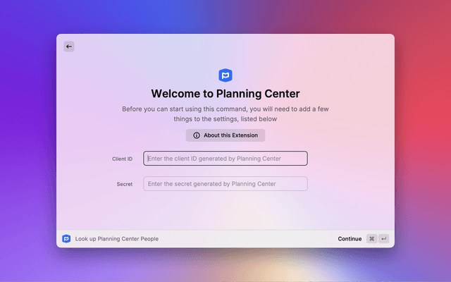 After installing the extension, open Raycast Preferences → Extensions → Planning Center for Raycast, and enter your Client ID and Secret in the provided fields on the right-hand side.
