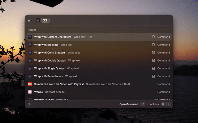 Assign a Raycast hotkey to each command for instant, keyboard-only wrapping — no need to open the Raycast bar at all.