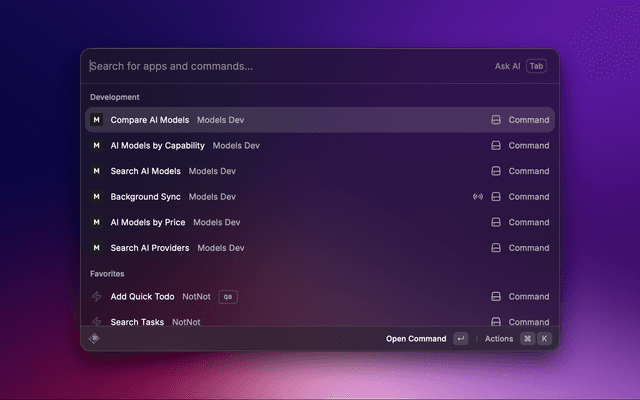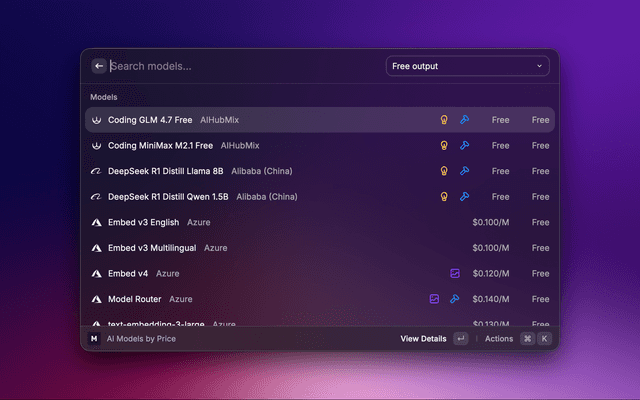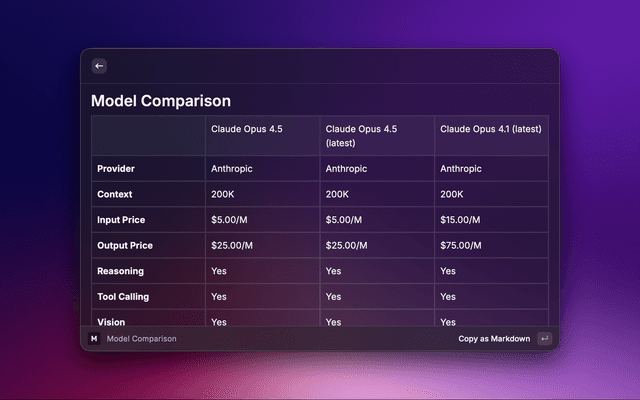 Select up to three models for side-by-side comparison. View pricing, context windows, and capabilities in a table. Export comparisons as markdown.
