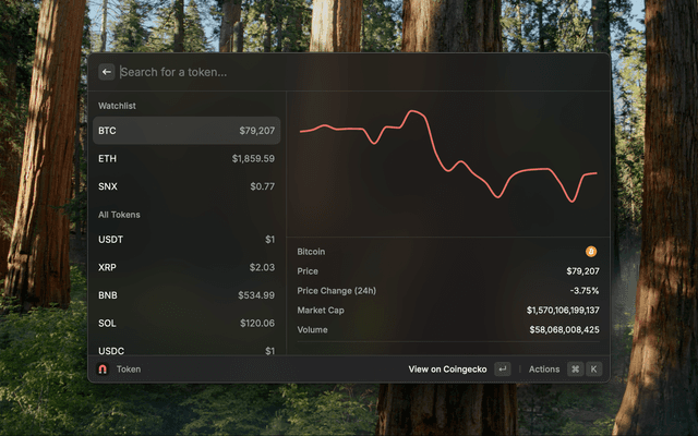 A powerful Raycast extension that brings real-time cryptocurrency price tracking to your fingertips. Monitor your favorite crypto assets, view detailed market data, and stay updated with price changes - all without leaving Raycast.