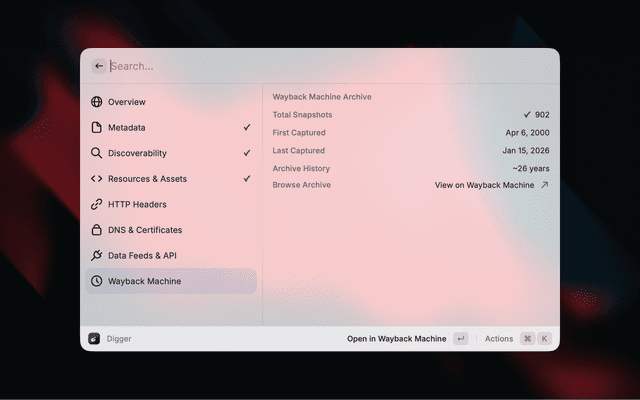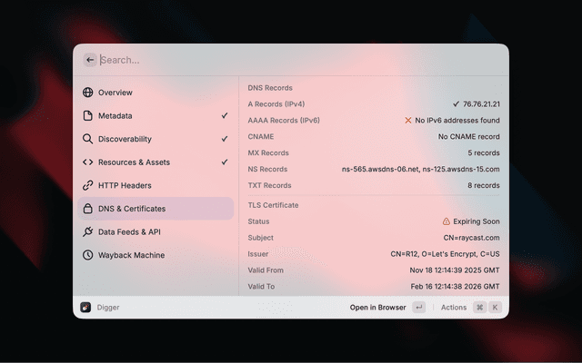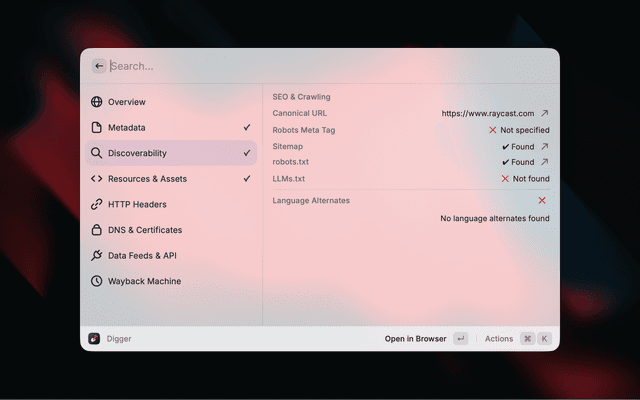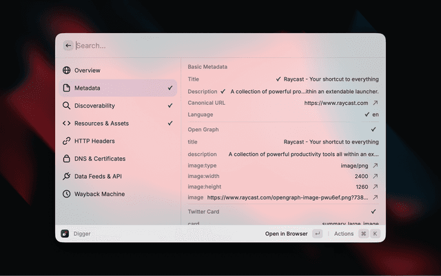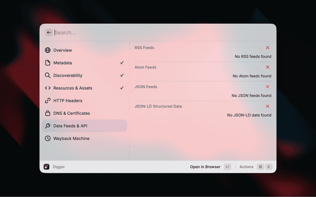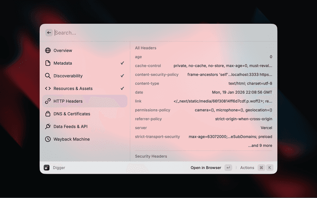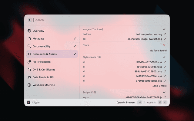 Digger surfaces contextual information about any website without needing to open developer tools. Enter a URL and instantly see metadata, SEO signals, security info, DNS records, and more.