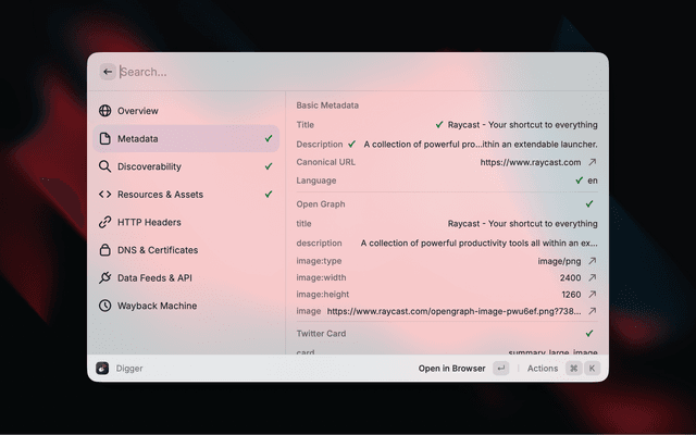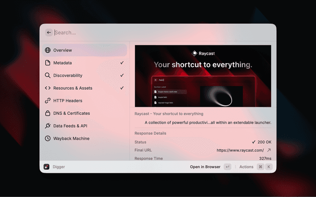 Like dig, but for the web. Comprehensive website intelligence and metadata extraction for Raycast.