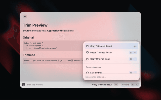 The current implementation ports the most useful Trimmy features for Raycast: