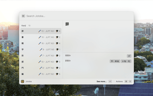 Raycast Jotoba is a Raycast extension designed to take advantage of the Jotoba project's API to lookup Japanese words and kanji quickly and easily.