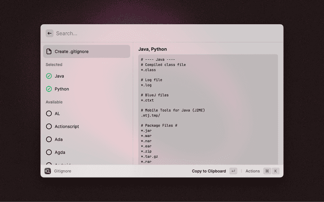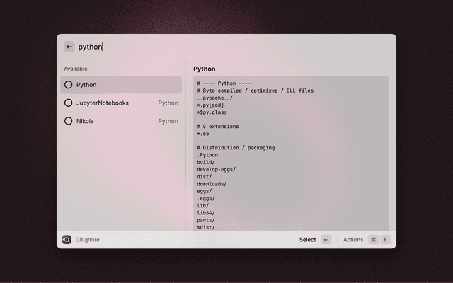 ⌘⇧P (or Ctrl + . on Windows) to add/remove templates from your favourites⌘⇧P / Ctrl + .: Toggle favourite status (Pin)⌘Y / CtrlY: Preview selected templates⌘⇧↩ / Ctrl⇧↩: Paste to active applicationTemplates are sourced from the GitHub gitignore repository.