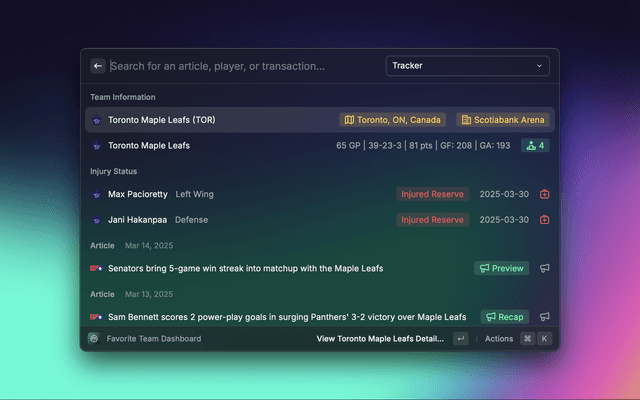 Tracker CommandView articles, injuries, and transactions (differs based on the league).