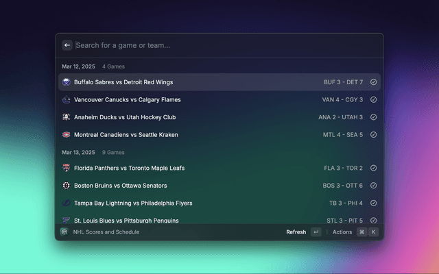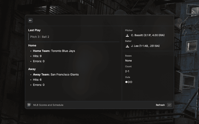 • Live Scores Command (Menubar): View live scores and upcoming games, and click on games to set them as the menu bar title, allowing users to view scores with automatic refreshes.