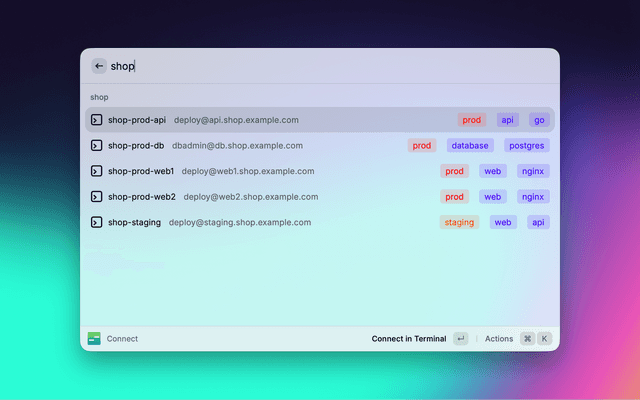 Fast SSH connection manager for Raycast. Fuzzy search and connect to servers from your hop config.