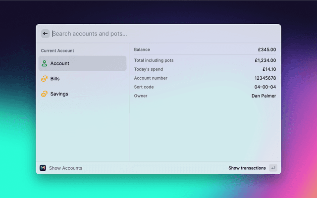 View your Monzo accounts, pots, and recent transactions.