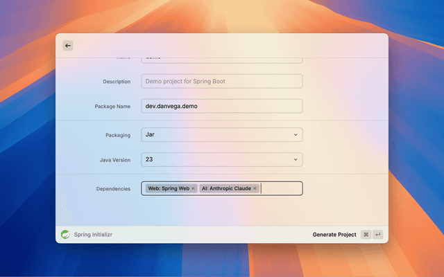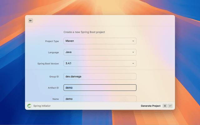 Generate Spring Boot projects directly from Raycast, powered by the official Spring Initializr service.