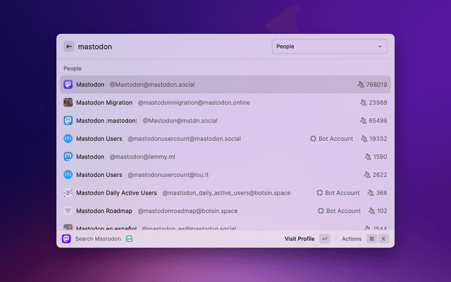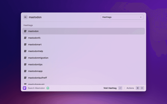 Search for people or hashtags on Mastodon! – This extension is not intended to be a full Mastodon client. Instead, it is a quick and easy way to get glanceable information about people and to navigate to pages on the Mastodon website. It intentionally does not include posting, browsing timelines, mentions, or even post search.