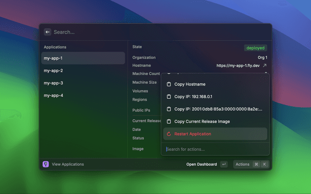 This extension allows you to list all the Fly.io applications you have access to, view their details and do a number of keyboard only operations, such as: