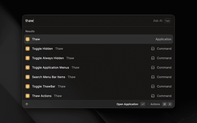 Control Thaw directly from Raycast. Toggle visibility sections, search menu bar items, and open settings without touching your mouse.