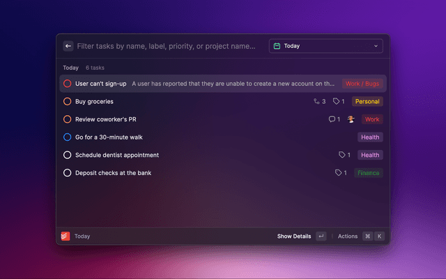 Check your Todoist tasks from within Raycast and quickly create new ones.