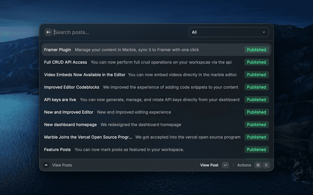 This extension lets you manage your Marble workspace directly from Raycast: