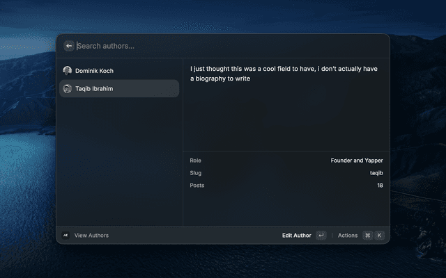 - Authors — Browse, create, edit, and delete authors with bio, role, and social links.