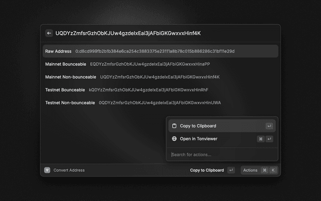 Convert TON blockchain addresses between different formats and resolve .ton domain names.
