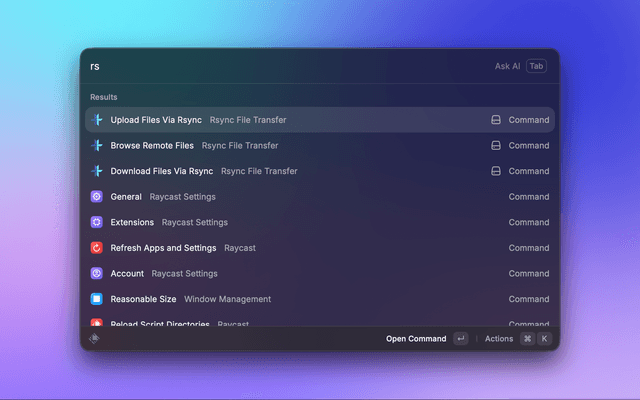 - Open Raycast and search for "Upload Files via Rsync"