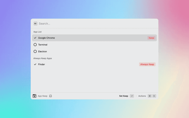 This extention offers users the ability to manage currently running applications, with options to choose which apps to keep open and which to close during cleanup. It's especially suited for users looking to optimize their work environment and increase productivity. Users can set apps to “Always Keep,” ensuring they aren't closed during cleanup operations. The extension also provides an intuitive interface to add or remove apps from the preset keep list and features a one-click function to close non-kept apps.