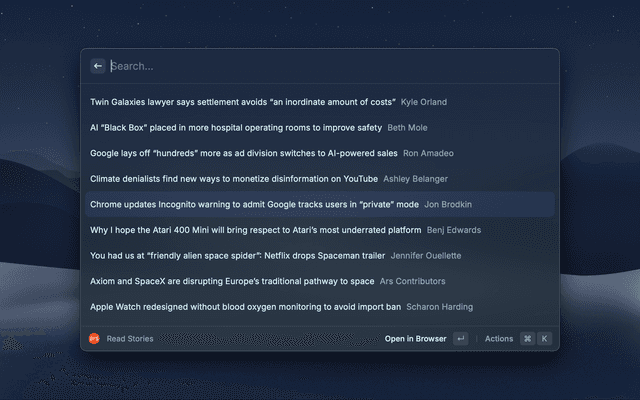 Shows front page of Ars Technica directly from Raycast