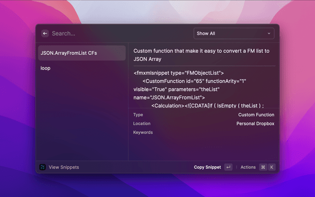 To use a previously saved snippet, open the "View Snippets" command and search for the snippet you want to use. Then simply press the return key to copy that snippet to your clipboard as a FileMaker object, ready for the pasting!