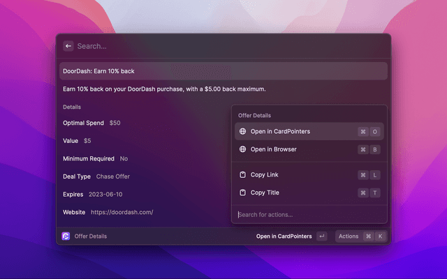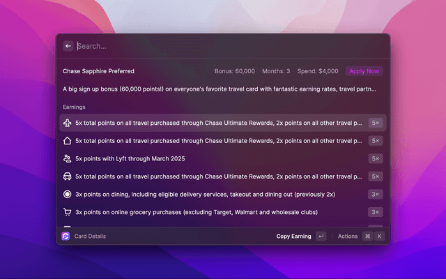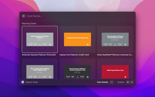 Search for any card or Amex/Chase offer detail, right in Raycast.