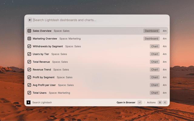 - Open Raycast and type "Search Lightdash"