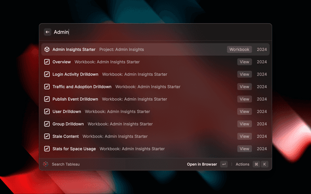 Tableau Navigator is a Raycast extension that allows you to quickly search and access your Tableau dashboards and visualizations from anywhere on your Mac.