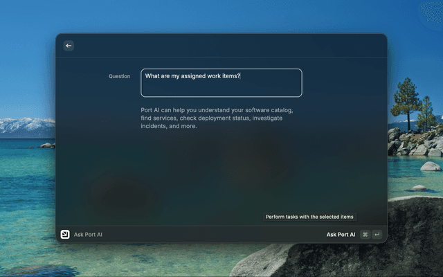 Access your Port internal developer portal directly from Raycast. Browse dashboards, run self-service actions, search your software catalog, and ask Port AI questions.