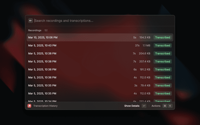 Audio recordings are stored locally in a dedicated directory managed by Raycast. You can manage or delete these recordings through the Transcription History feature.