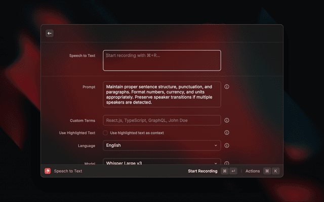 A Raycast extension that allows you to convert speech to text using Groq's API.