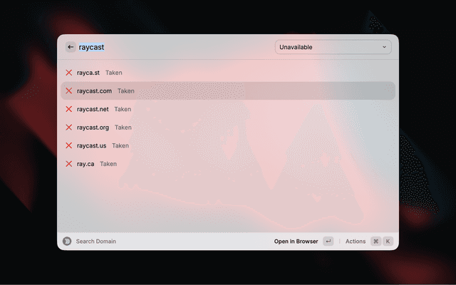 Sign up at Fastly if you don't have an account. You'll be required to provide a valid credit card number.Navigate to Domain Research APIClick "Enable" and then "Purchase Now" to enable the API (first 10,000 requests/month are free).Enable 2FA on your Fastly account (required to create API tokens)Navigate to API Tokens (you may need to reauthenticate)Click "+ Create Token"Enter a name, e.g. "Raycast"Enter this token in the extension's Preferences or at the first promptThis extension previously used the Domainr API via RapidAPI.