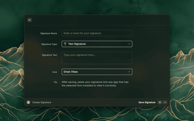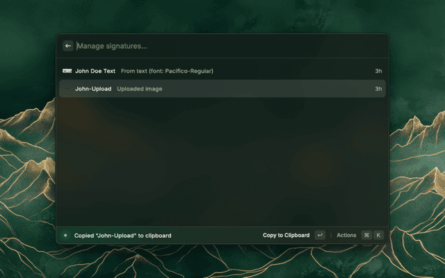 A lightweight Raycast extension for creating, saving, and instantly copying your e‑signature.
