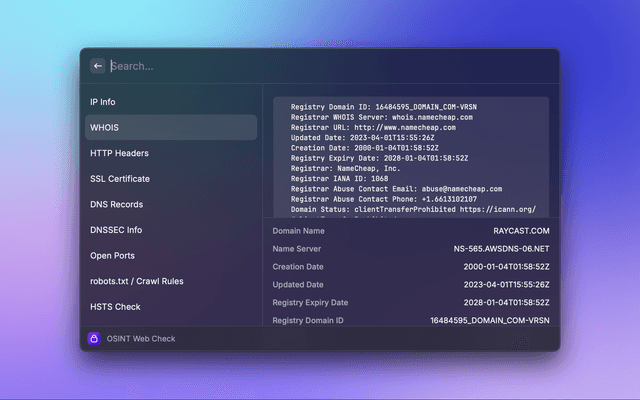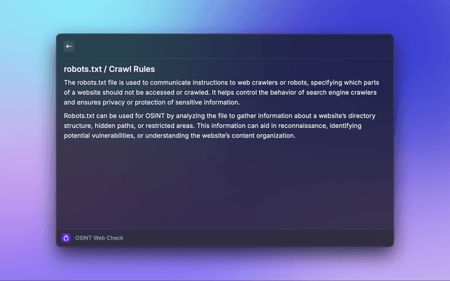 The OSINT Web Check extension is an extension to deploy some OSINT (Open Source Intelligence) checks against a provided URL, inspired by web-check by Lissy93.