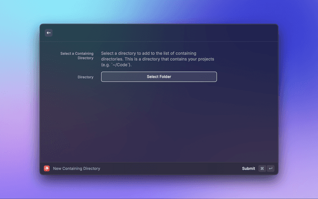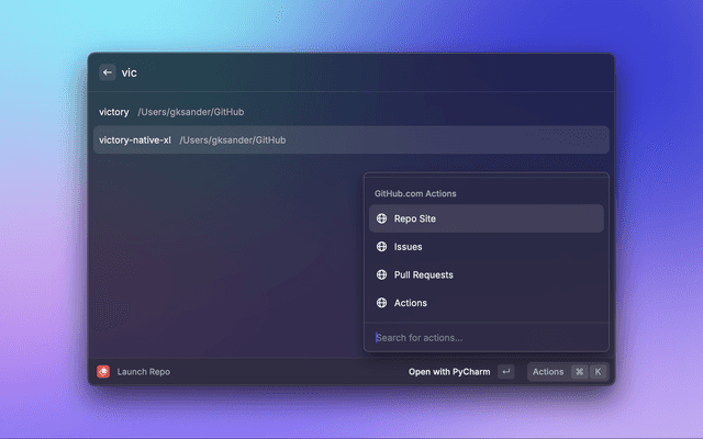 Once you've found the project you want to launch, press Enter to launch it in the first application in your "Launch Commands" list from the settings view. Or press Cmd + K to select a different application to launch it in.