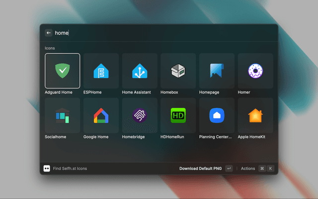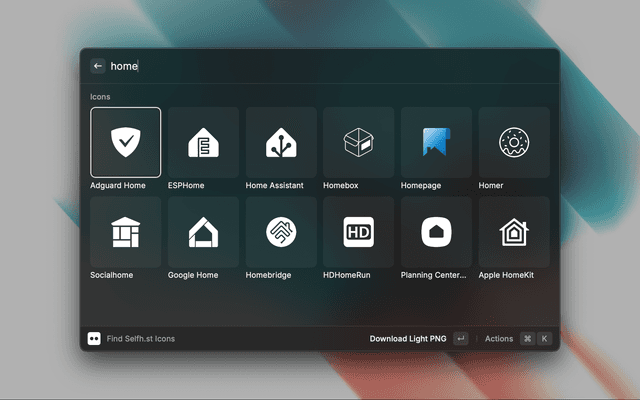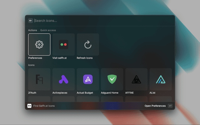 A Raycast extension for finding and using self-hosted icons from the selfh.st service. This extension allows you to easily search, preview, and use icons in various formats (PNG, SVG, WebP) with support for both light and dark variants.