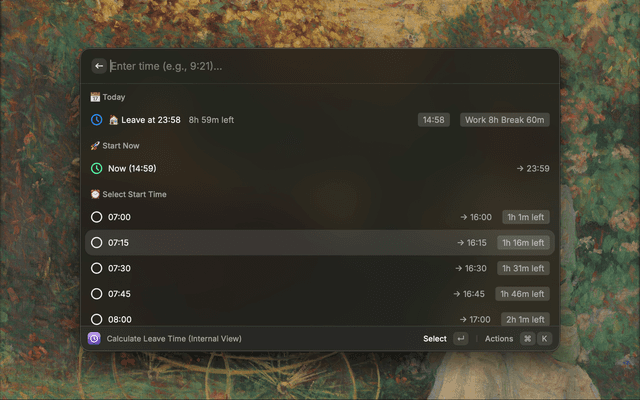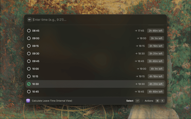 A Raycast extension that calculates your leaving time and remaining work hours by simply entering your arrival time.